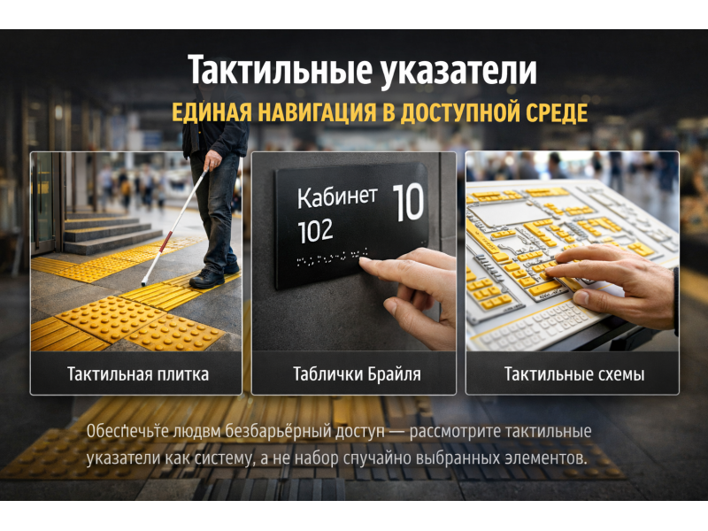 Их «миссия» - сделать так, чтобы незрячий мог подтвердить свое местоположение, не полагаясь на догадки. А чтобы тактильные таблички работали правильно, важно учитывать место расположения, высоту размещения, контраст и читаемость шрифта Брайля. И если нарушить что-то из этого, указатель теряет смысл и становится формальностью. А мы же стремимся к созданию по-настоящему «доступной среды», не так ли?